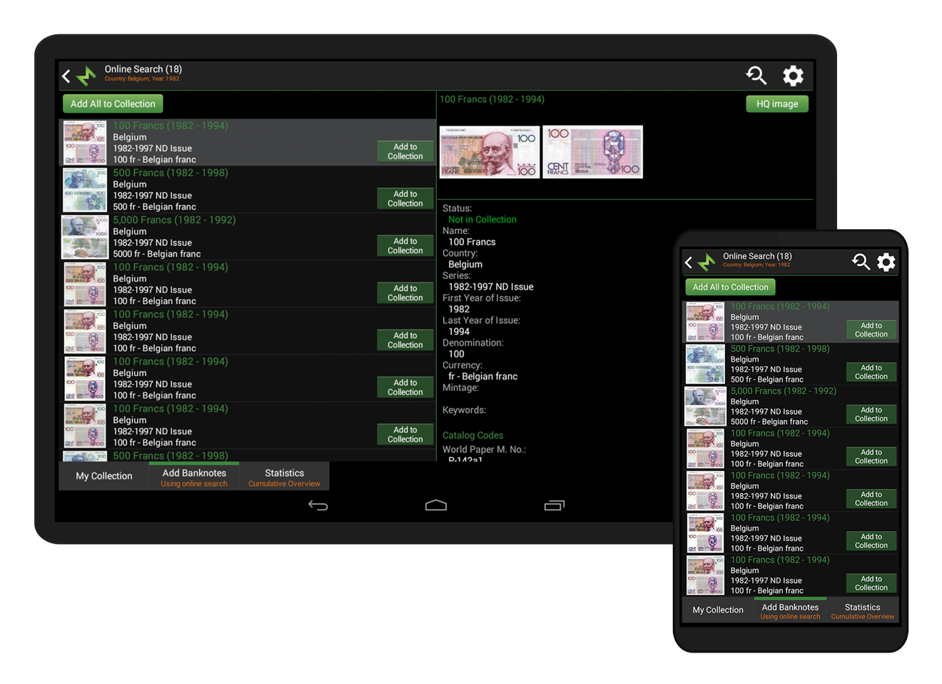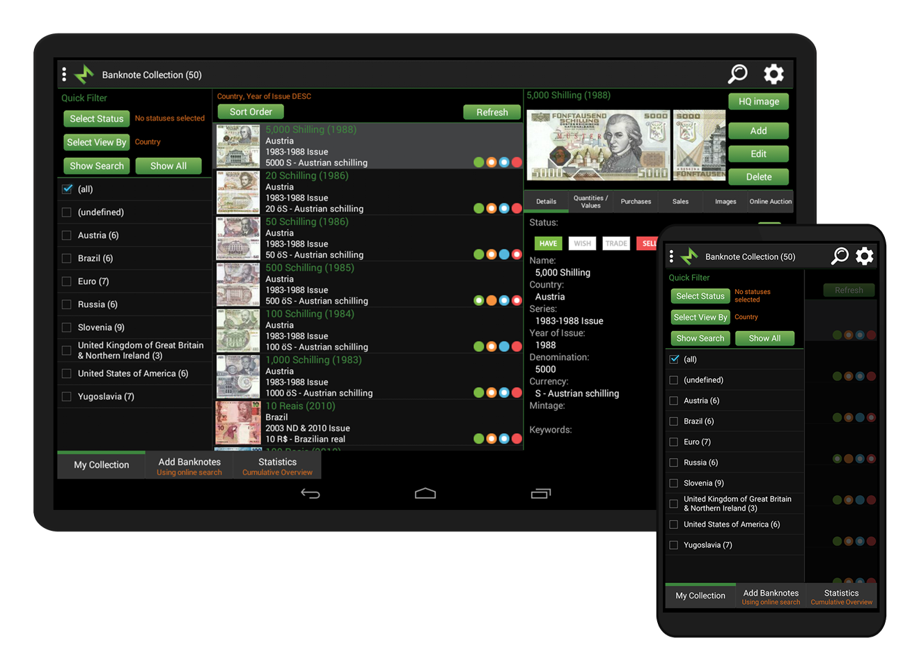 Simply browse your banknote collection. Sort lists any way you want. Find banknotes quickly and easily.