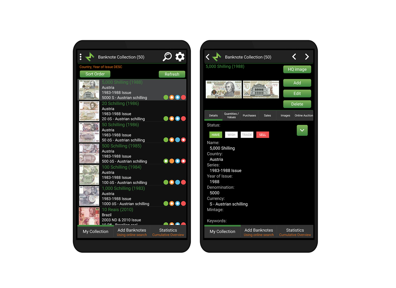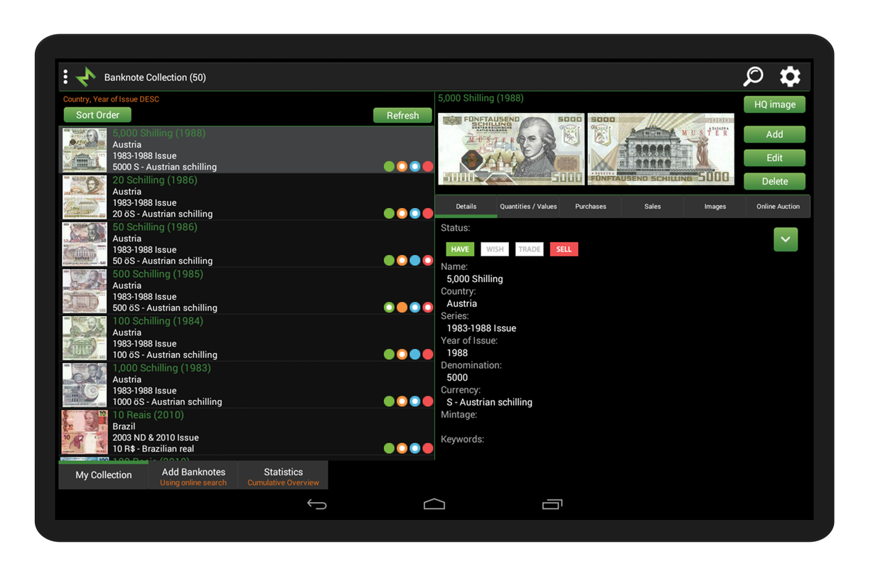 Tag your banknotes with Have, Wish, Trade and Sell status with simple click on status button or customize your own status list.