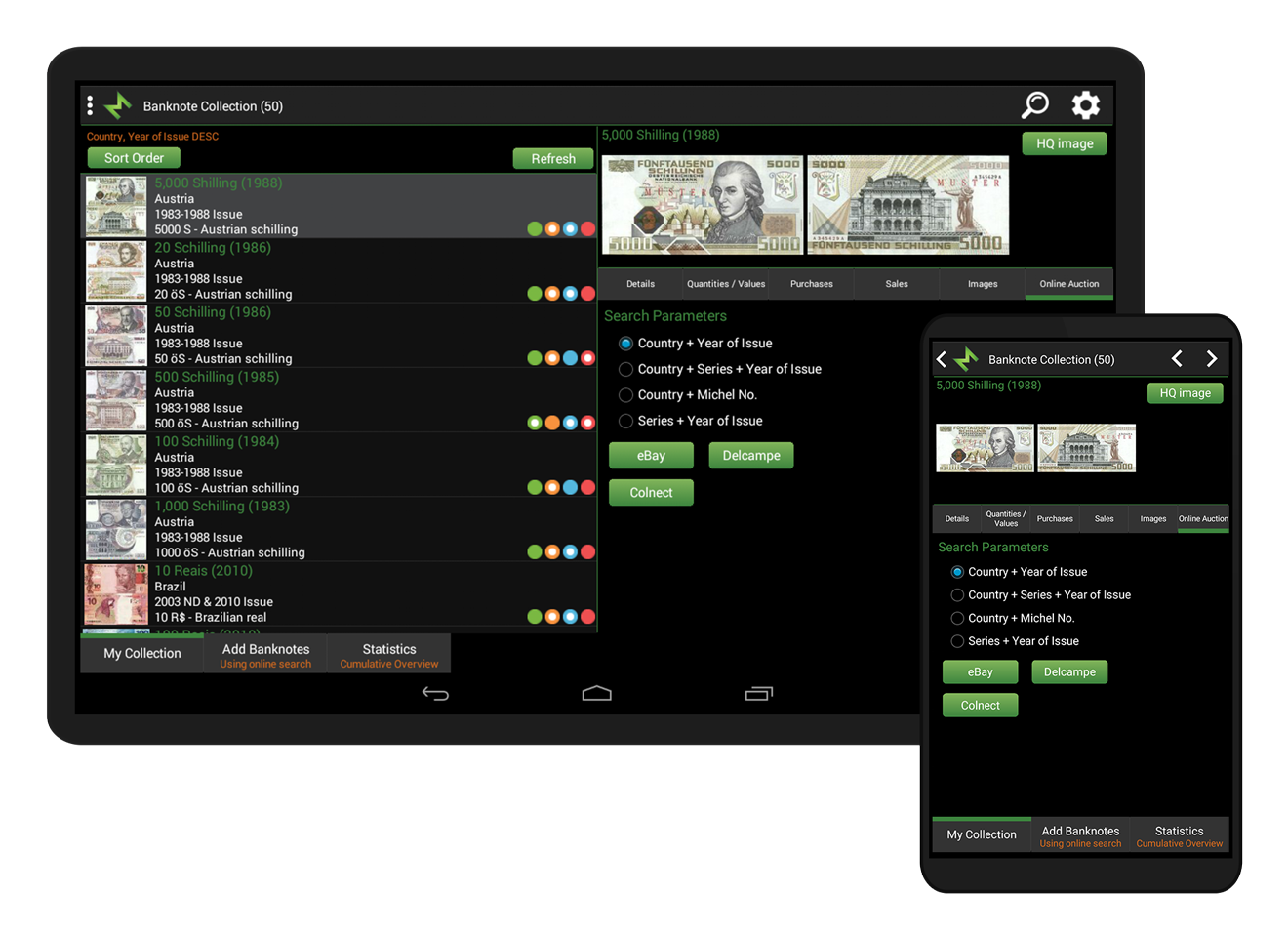 Automatically import banknote information with images using Colnect's online database with more than 172.000 banknotes from 315 countries.
