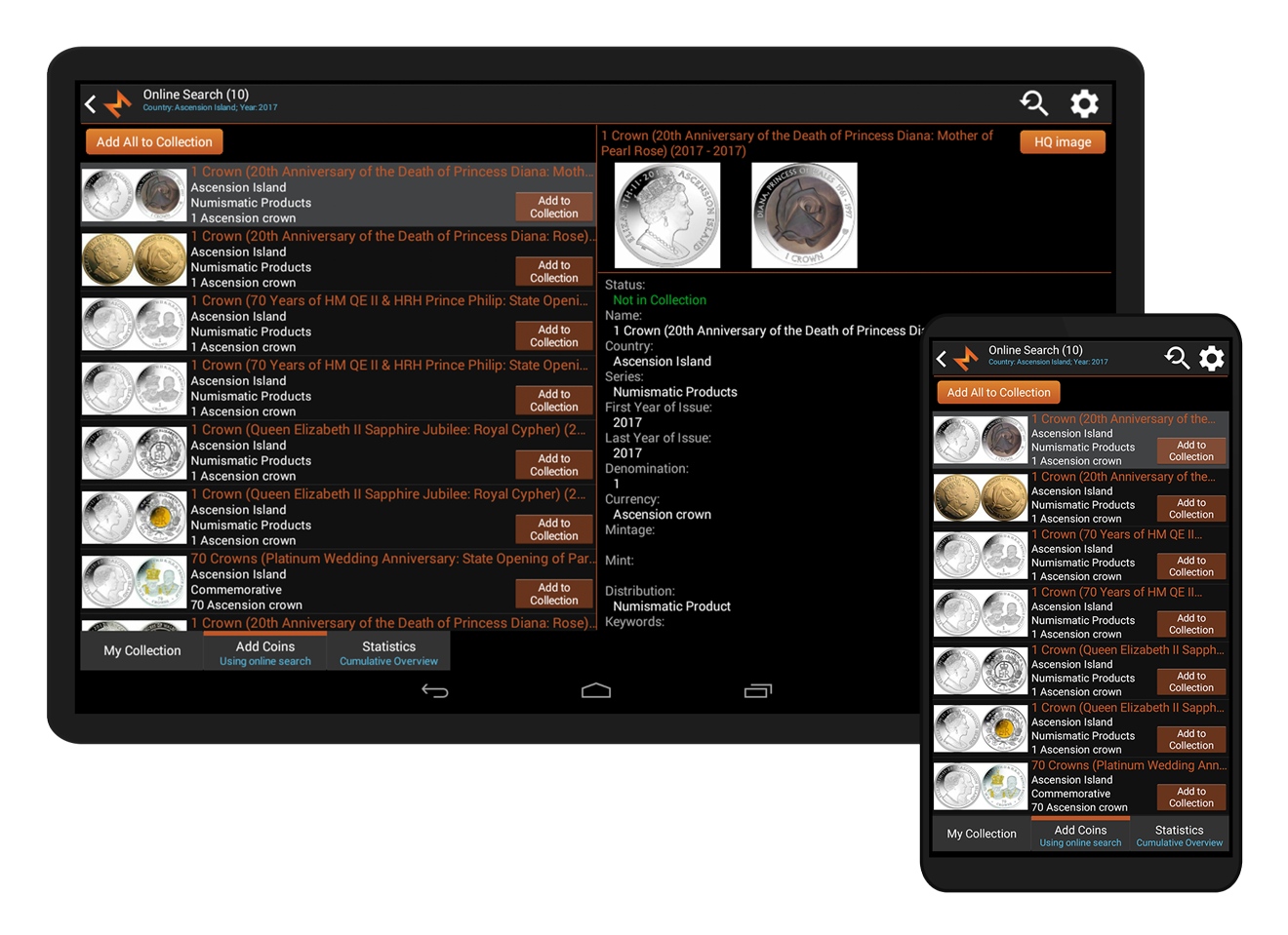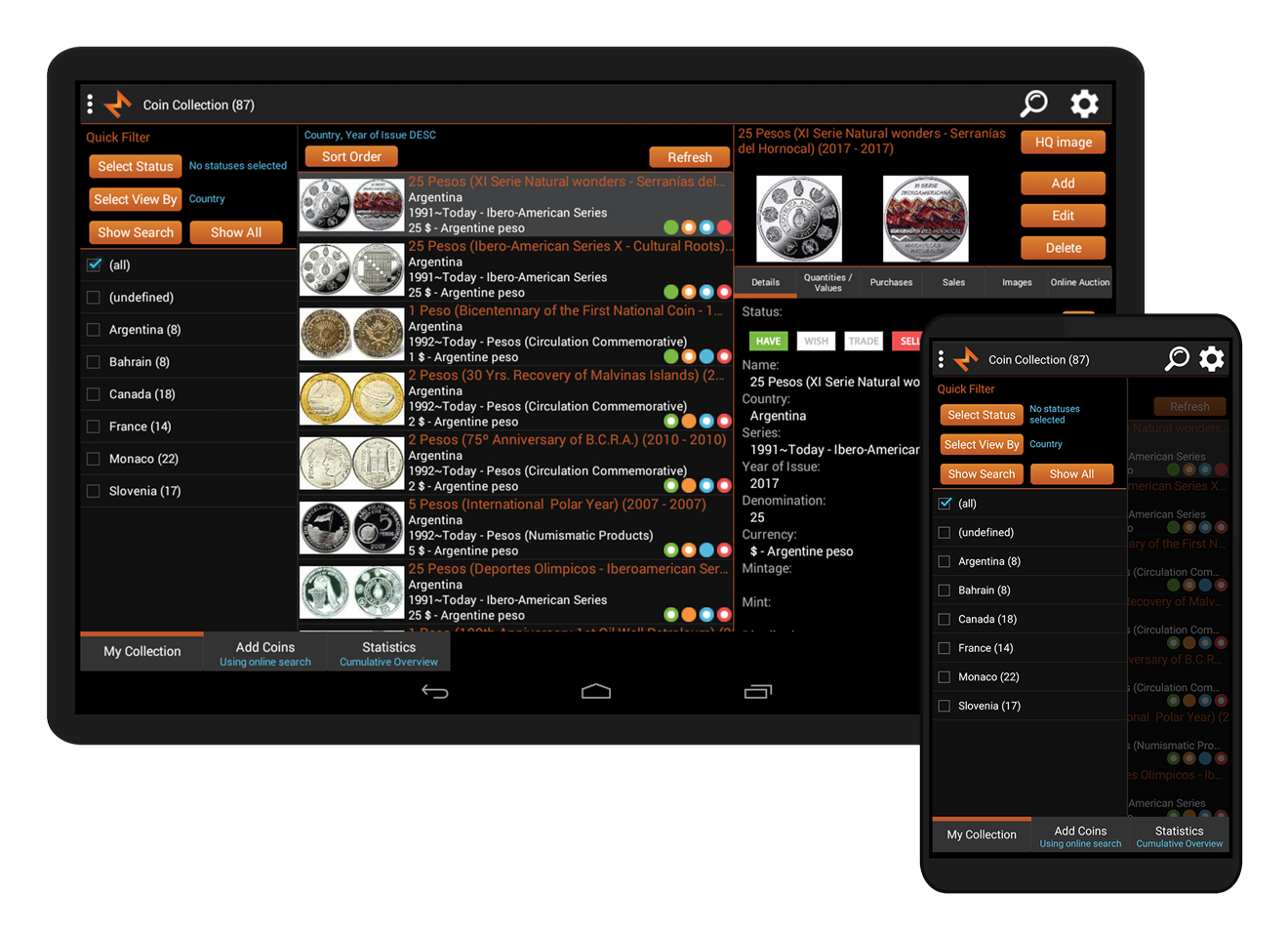 Simply browse your coin collection. Sort lists any way you want. Find coins quickly and easily. Keep track of your collection and wishlist.