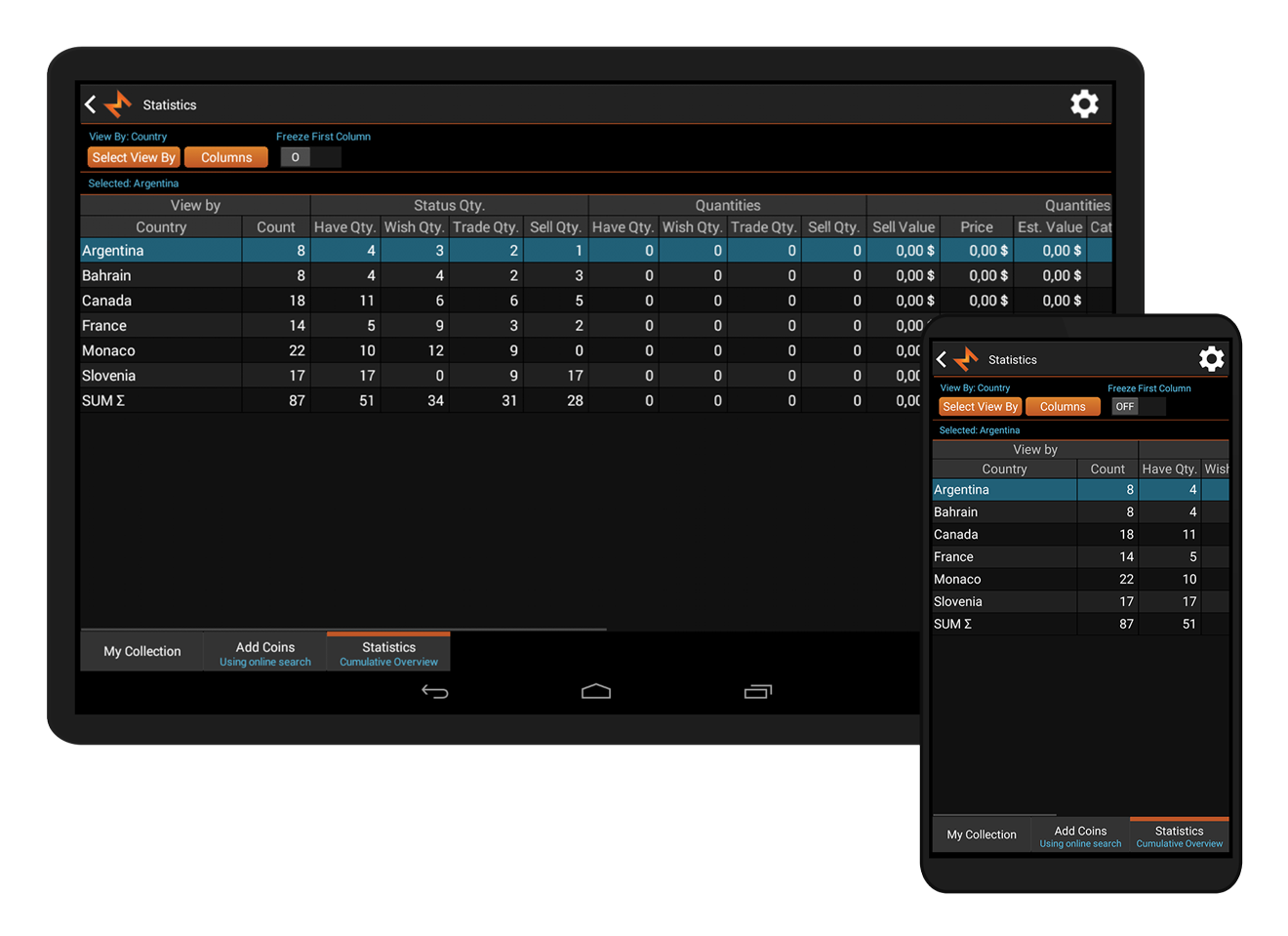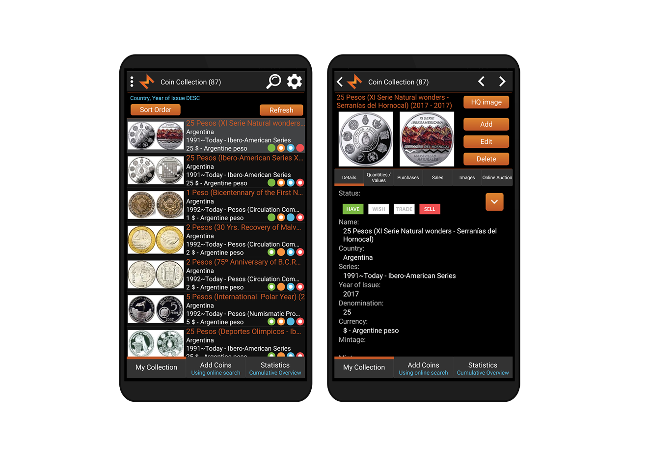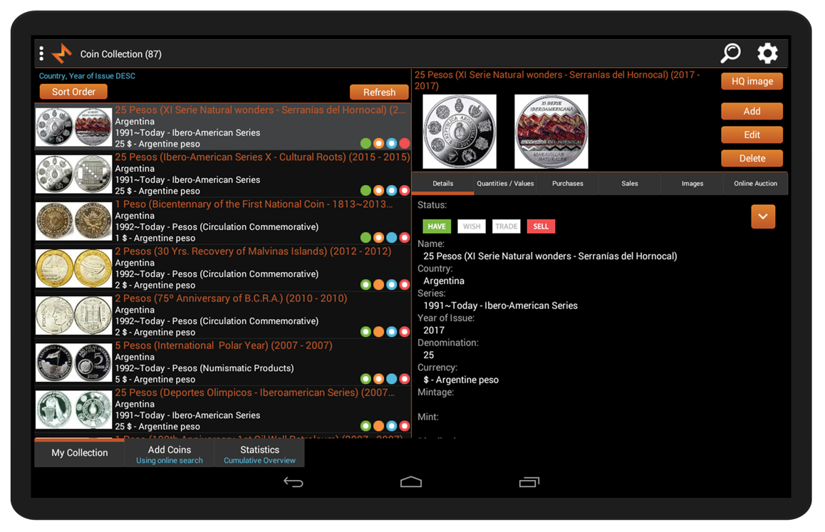 Tag your coins with Have, Wish, Trade and Sell status with simple click on status button or customize your own status list.