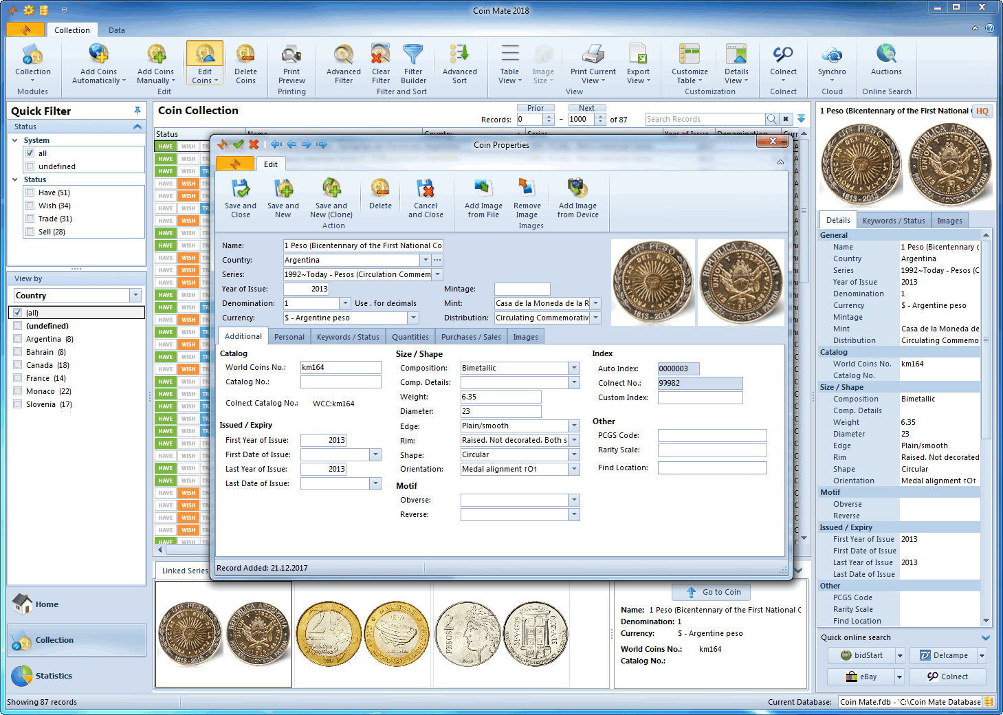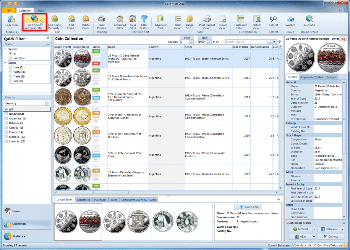 Automatically import coin information with images using Colnect's online database with more than 206.000 coins from 526 countries.