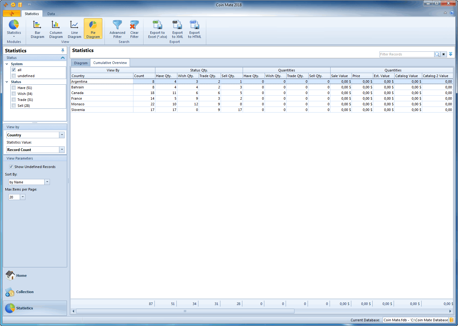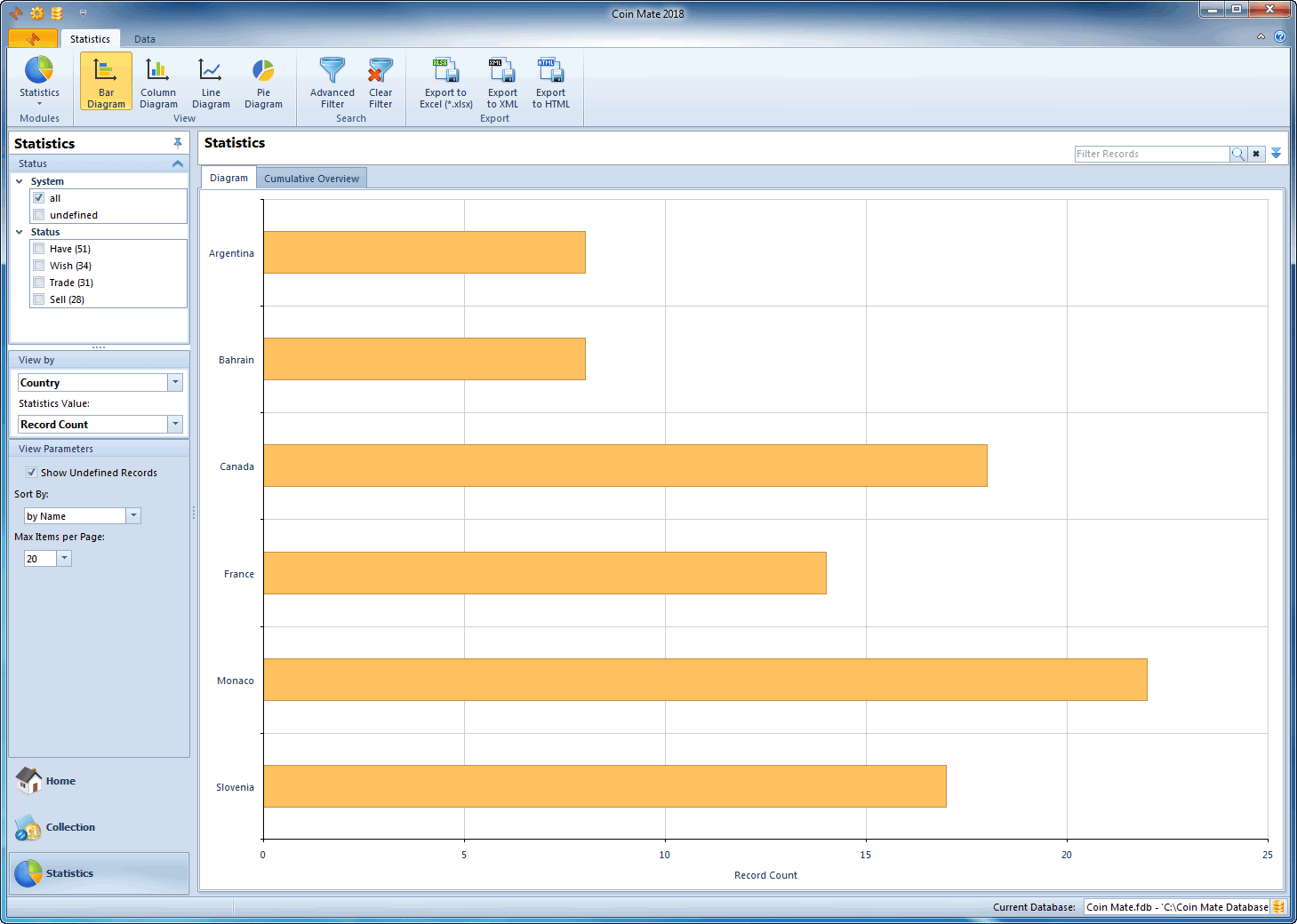 View collection statistics in the form of bars, columns, lines or pie charts.