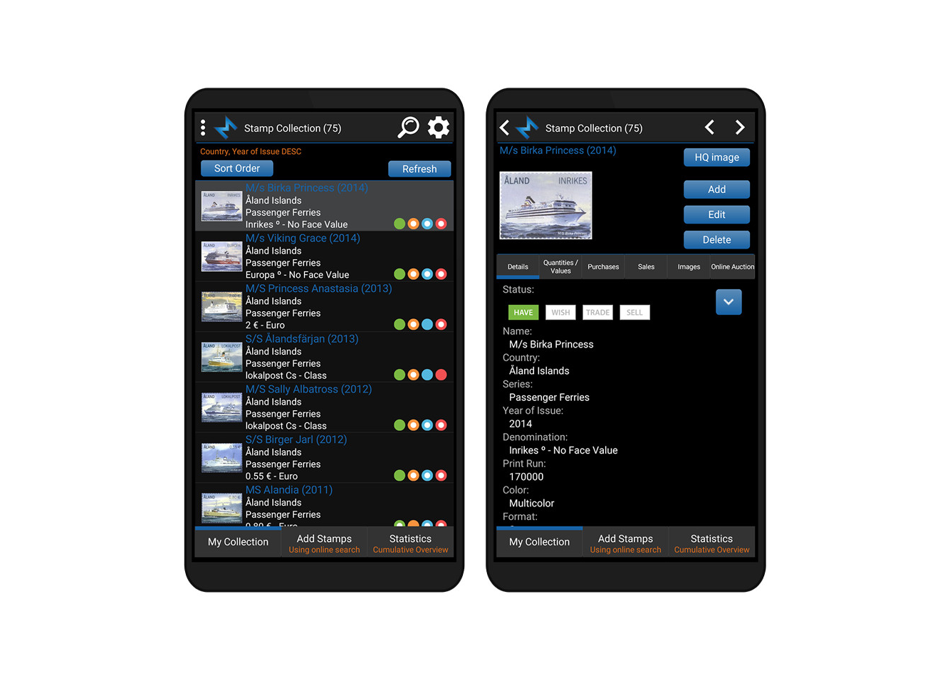 Tag your stamps with Have, Wish, Trade and Sell status with simple click on status button or customize your own status list.