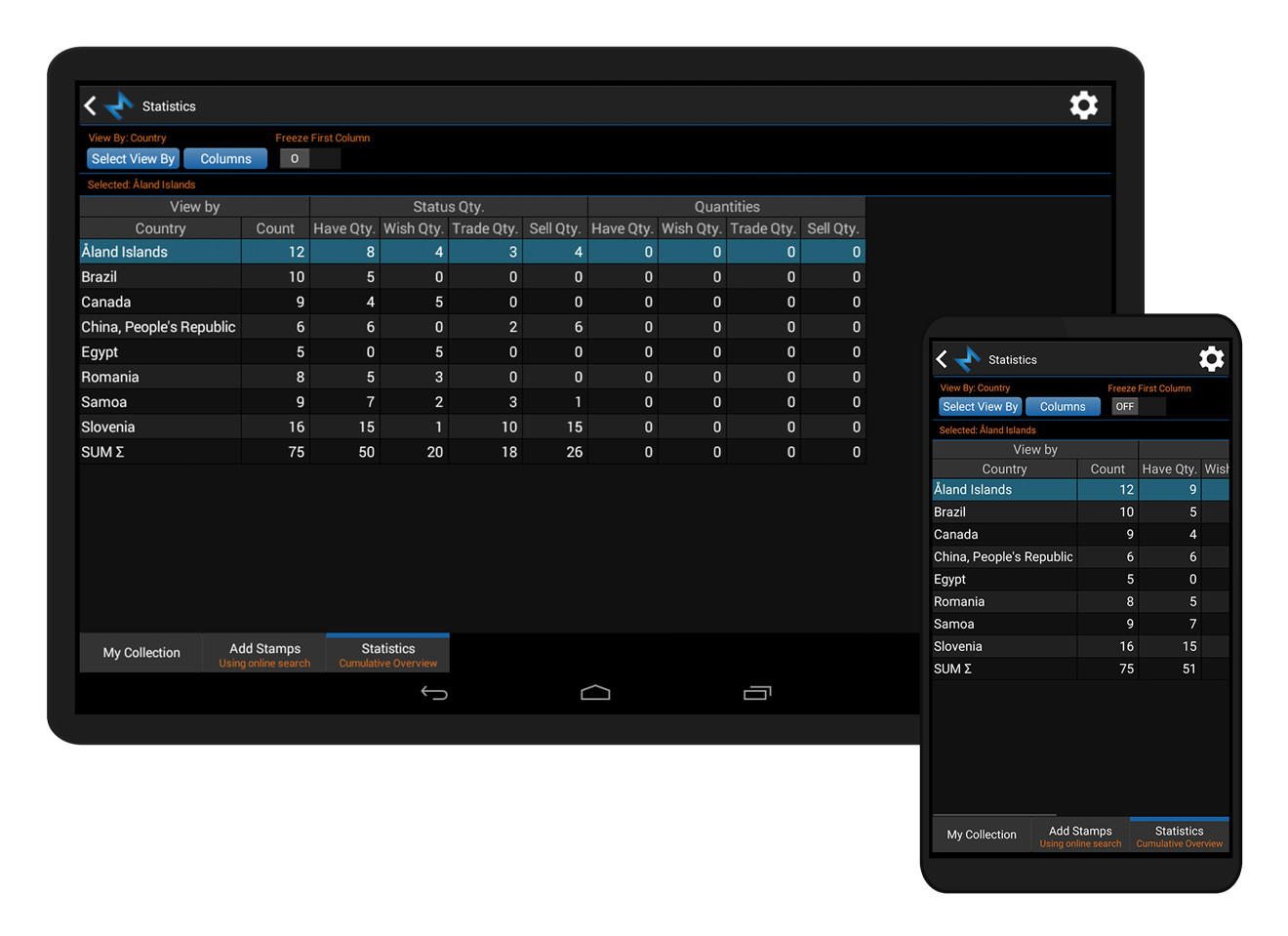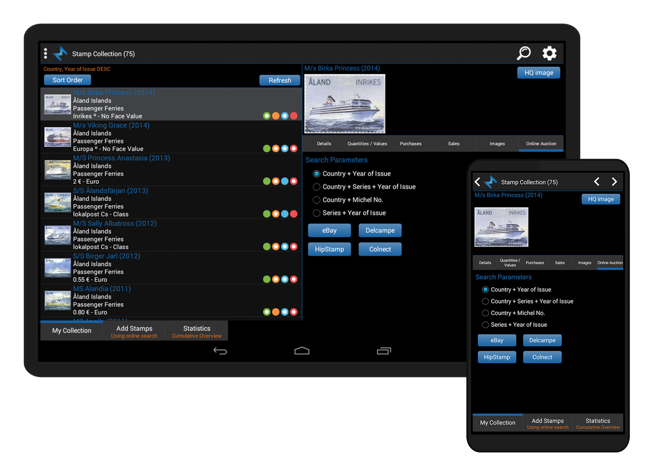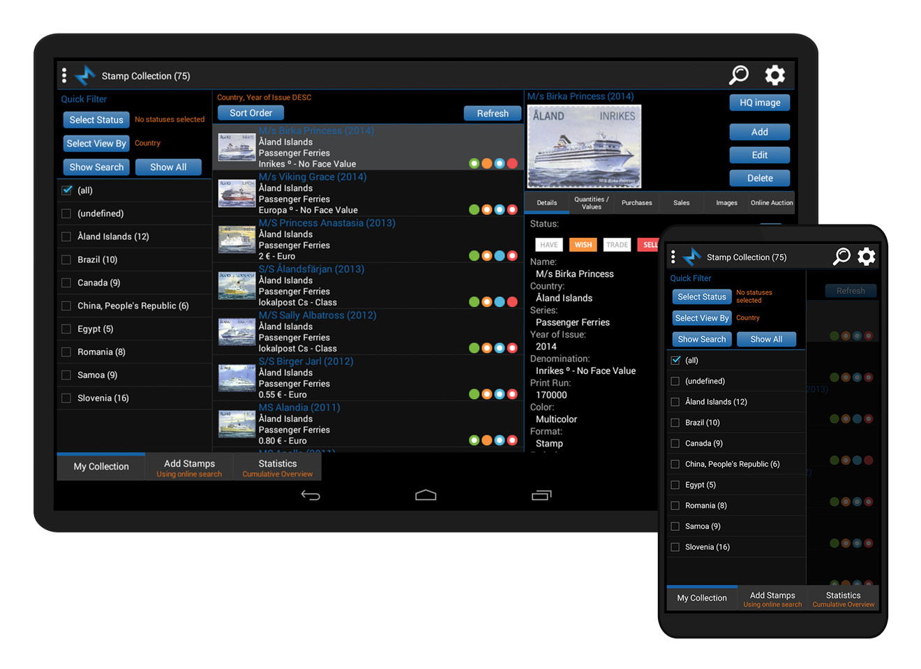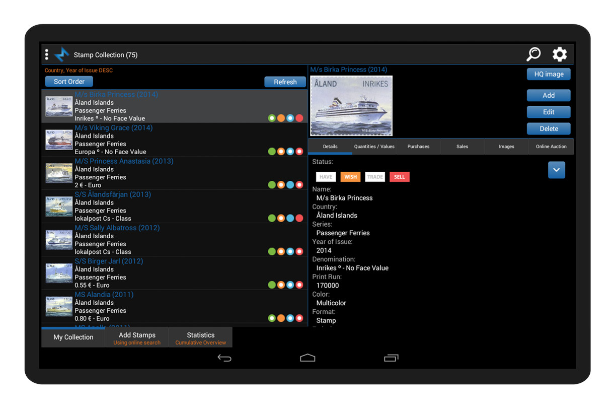 Simply browse your stamp collection. Sort lists any way you want. Find stamps quickly and easily. Keep track of your collection and wishlist.